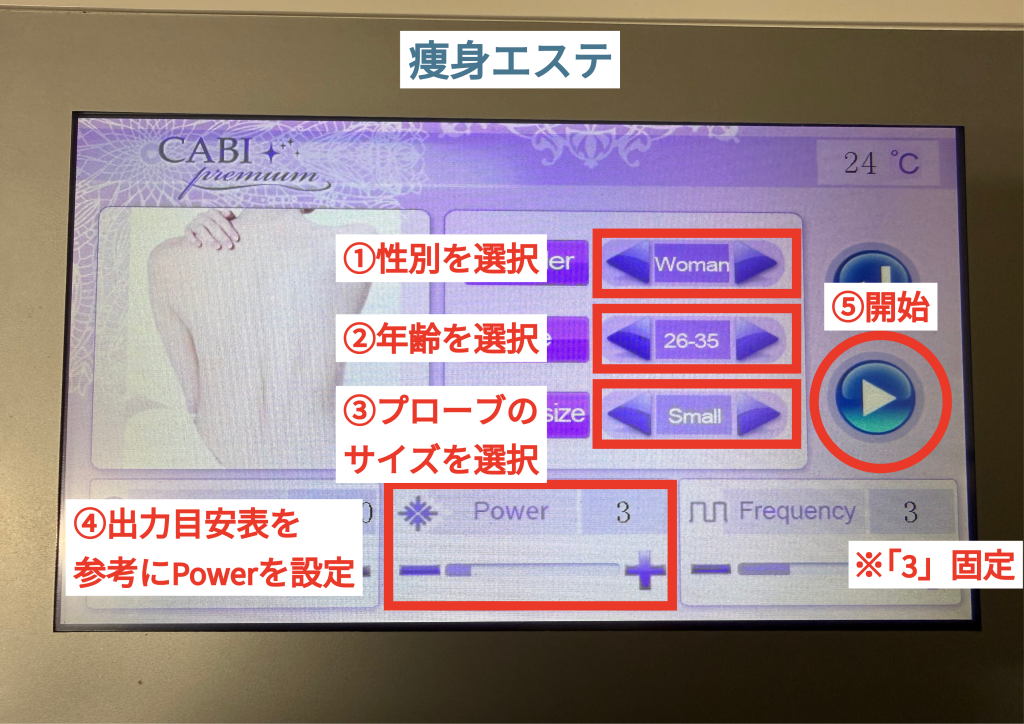 ⑤施術部位にジェルを塗り、手に残った場合は拭き取ってから、プローブを握ってください。